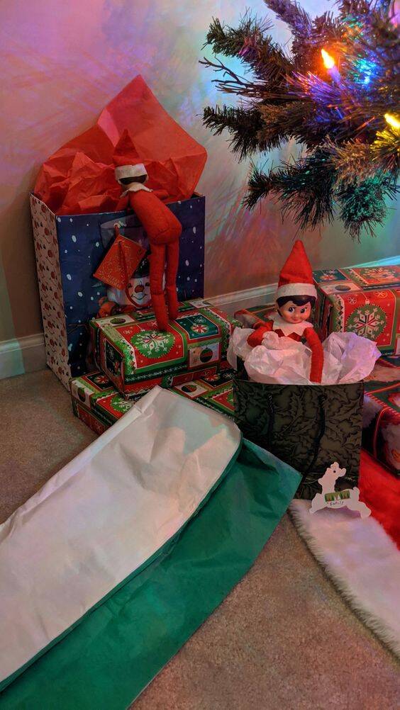 Position your elf peeking out from behind wrapped gifts or inside a gift bag.